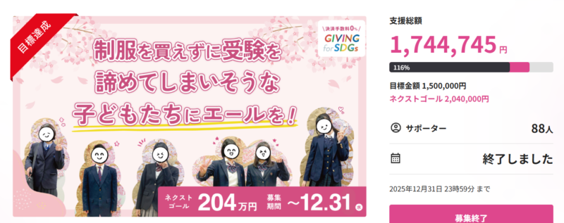 制服クラファン終了のご報告と御礼 おしらせ 2026.01.05 新高校生への制服支援クラウドファンディングが12月31日をもちまして終了いたしました。88名もの方々に1,744,745円のご支援を賜り、目標金額を達成することができました!皆様の温かいご支援に感謝申し上げます。困難を抱えつつも頑張っている子どもたちへ、必ず希望を届けます。
